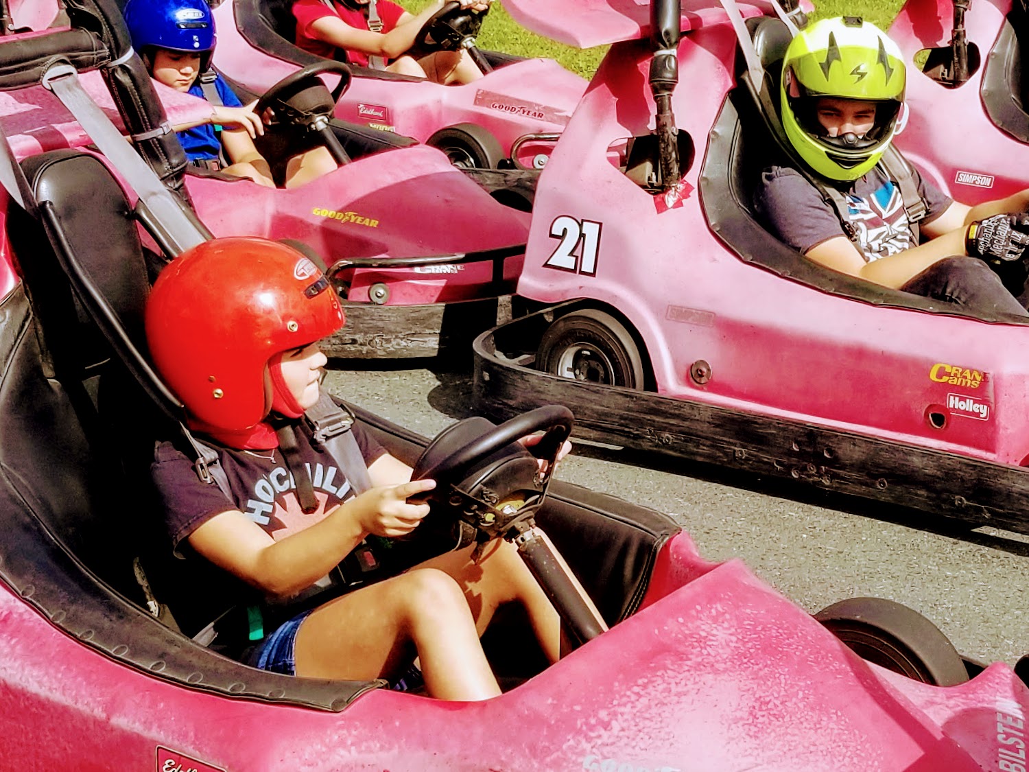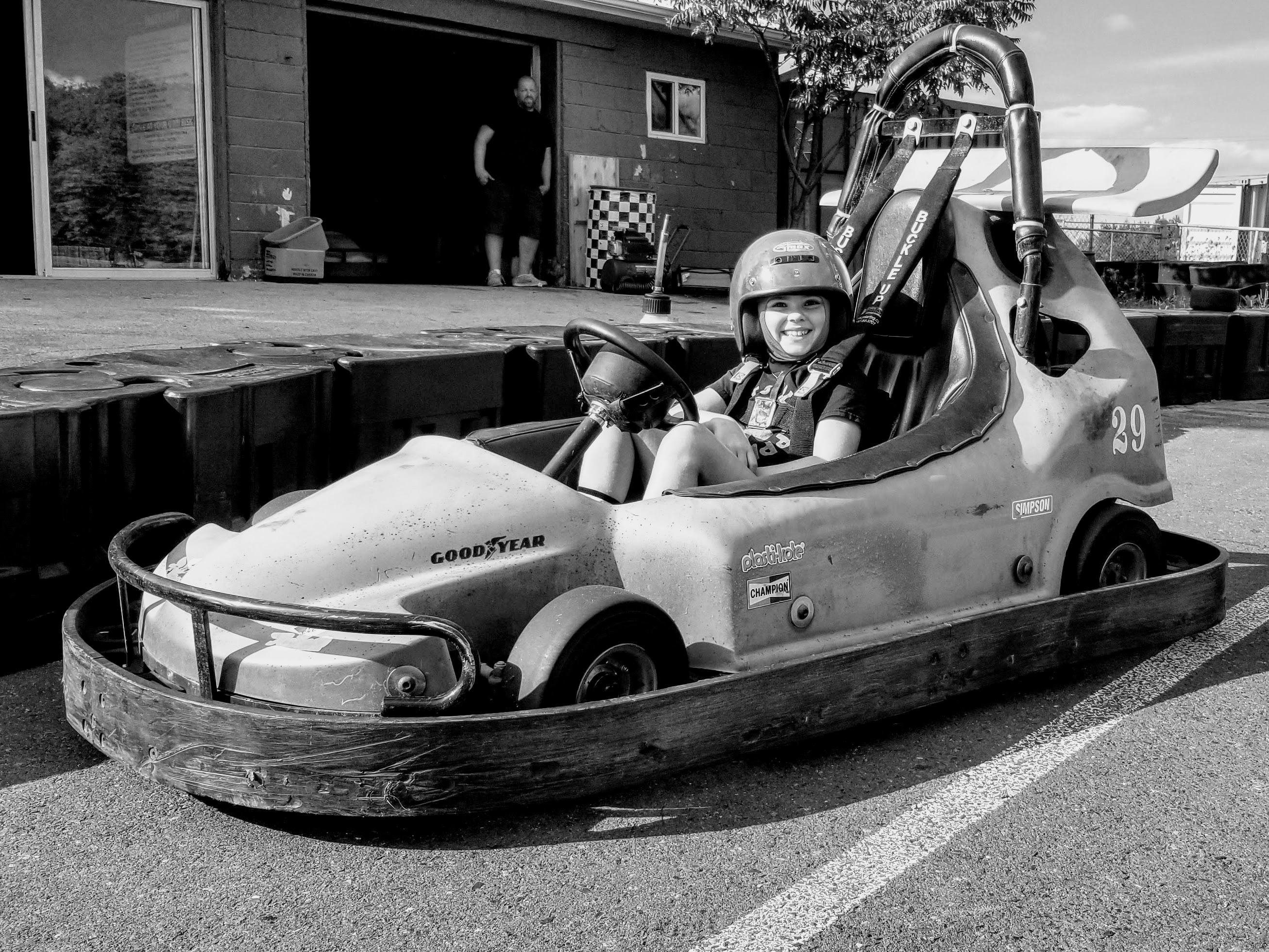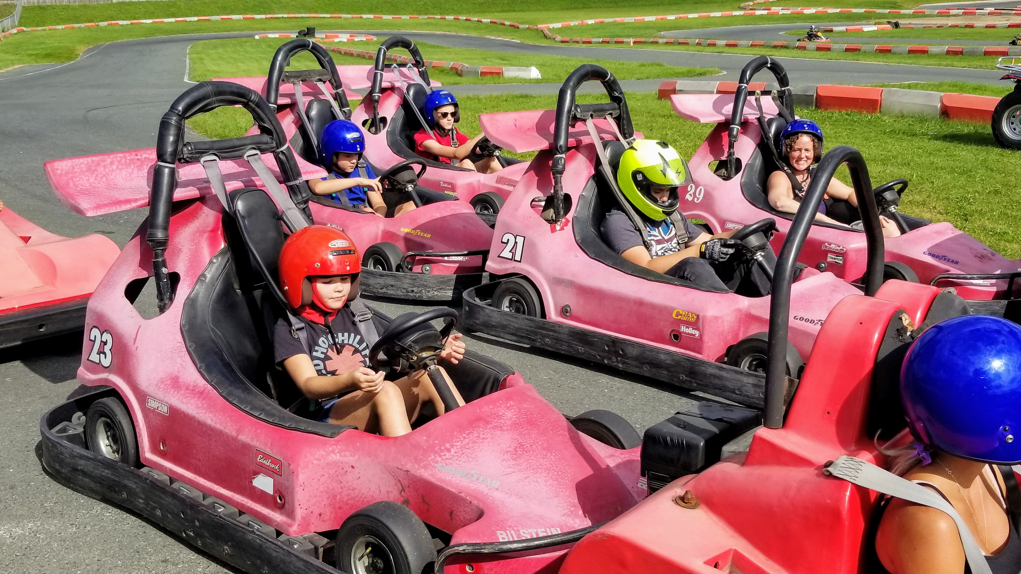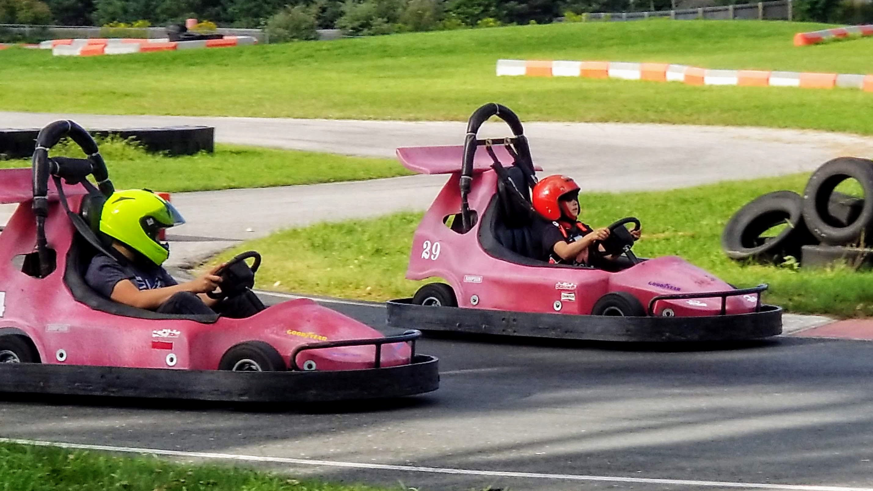 Rob strapped us in and explained all the rules. I got a good laugh at Big Brian’s pink shoes. They are so funny! When it was time to go, they started up all the karts and we got moving. At first, I was driving really slowly. My brother even had to slow down, so I could catch up!