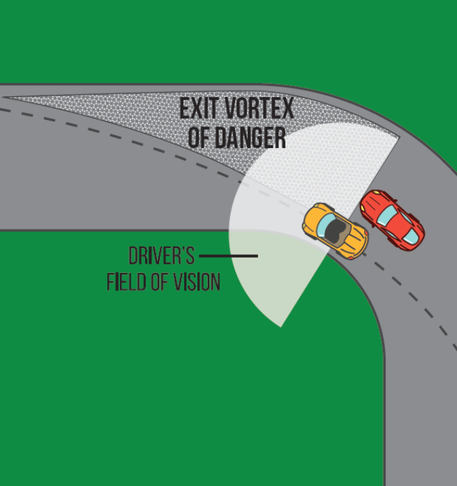 The Exit Vortex of Danger is a triangle inscribed by the apex, the track-out point of the lead car, and the outside edge of the road. When attempting a pass on the outside, be aware of the Exit Vortex of Danger, and back out of it if not in the lead car’s vision. It’s too late to safely pass. The hole you see on the outside is closing rapidly, you are in a blind spot, there will likely be contact, and it will be your fault.