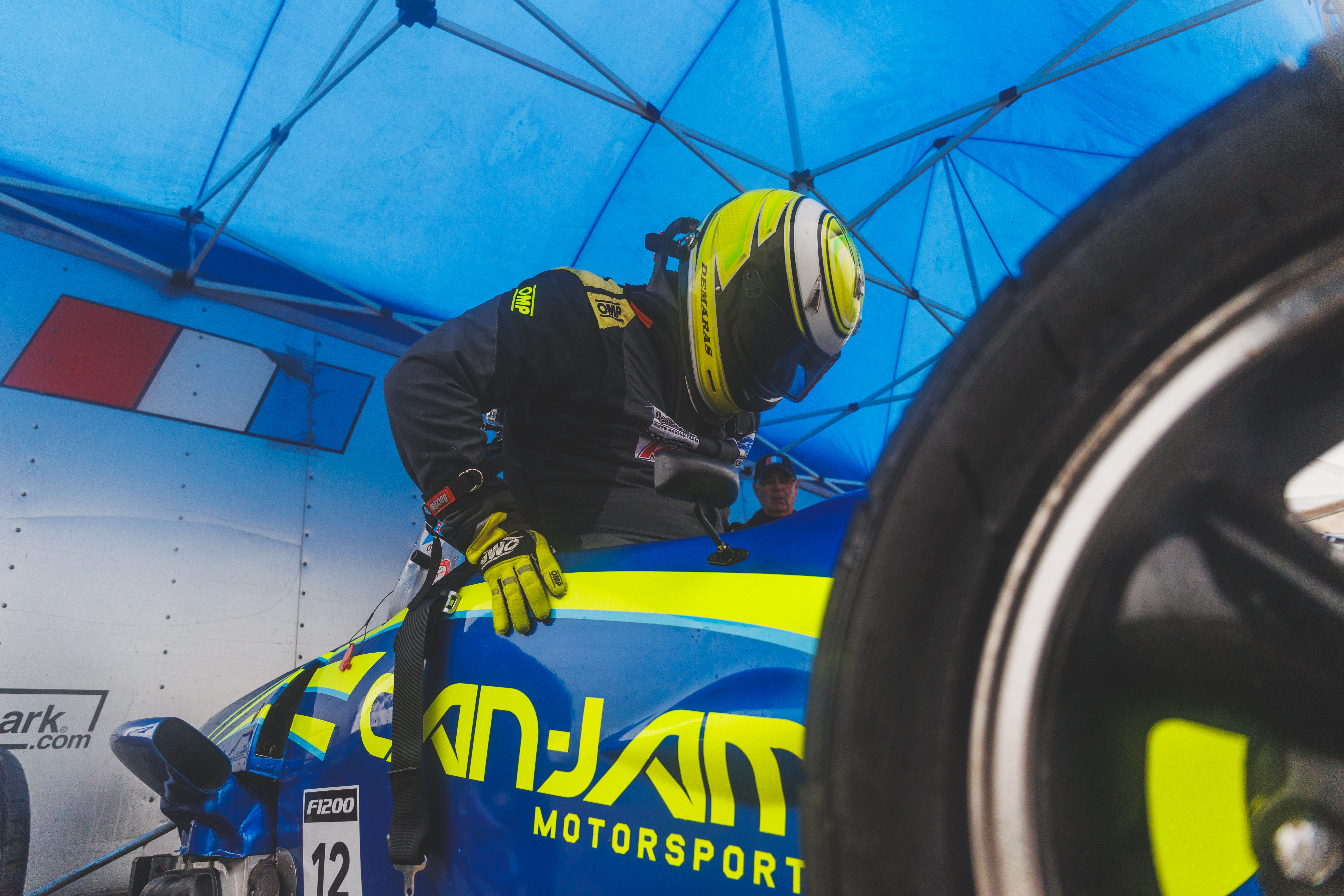 Back at the track on Sunday morning. Skies bleak and grey, with steady rain falling. Daniel Demaras’ fist pole position in F1200 came at Mosport in the rain last year, and it’s just the kind of driving conditions that he excels in.