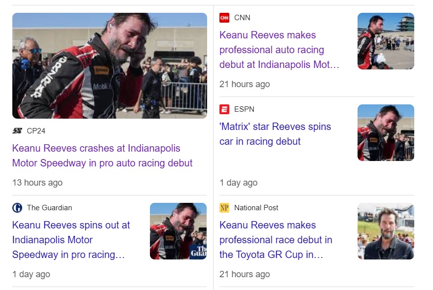 When I got home from the racetrack on Sunday, my wife commented ‘Keanu crashed at Indianapolis.’ I pushed back saying he just had a spin, but she insisted the news crawler just told her so. Sure enough, here’s what it said…