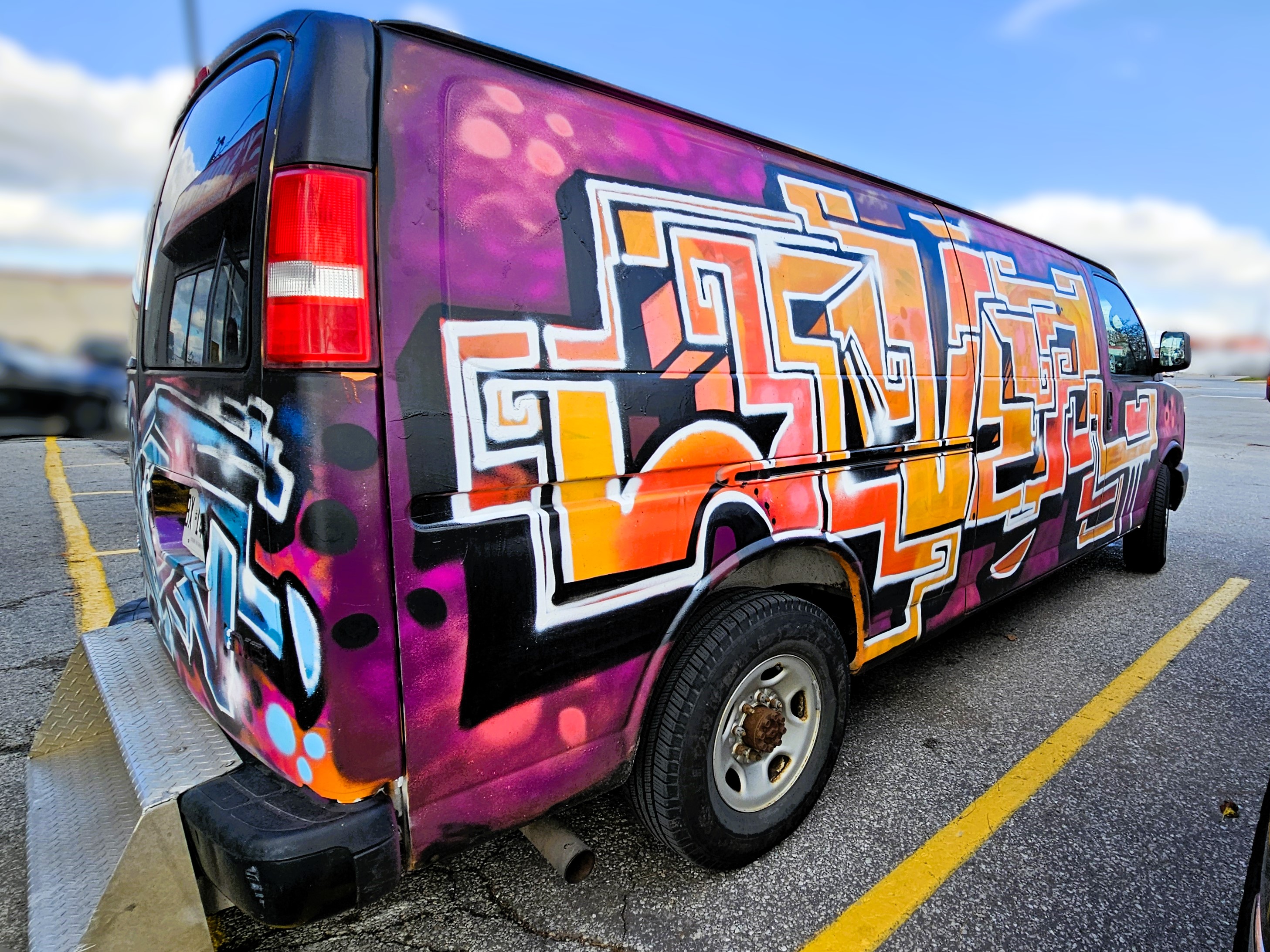 Driving around Toronto, we spotted this GMC Savanna Cargo van parked at a fast food diner. Talked to the owner just long enough to ask him if it was a wrap, he rolled his eyes. Said an ‘artist’ came up from New York City to custom graffiti spray-paint the van.