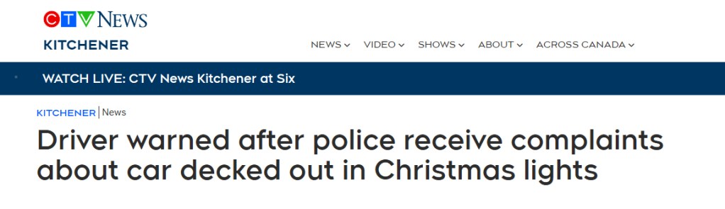 On Sunday, around 6:30 p.m., Waterloo Regional Police stopped a vehicle completely covered in lit Christmas lights in the Bridgeport Road East and Weber Street South area. Prior to the stop, police had received a complaint about a vehicle that was distracting drivers with its festive decorations. The driver was warned that having the lights on is not allowed under the Highway Traffic Act, but no charges were issued.