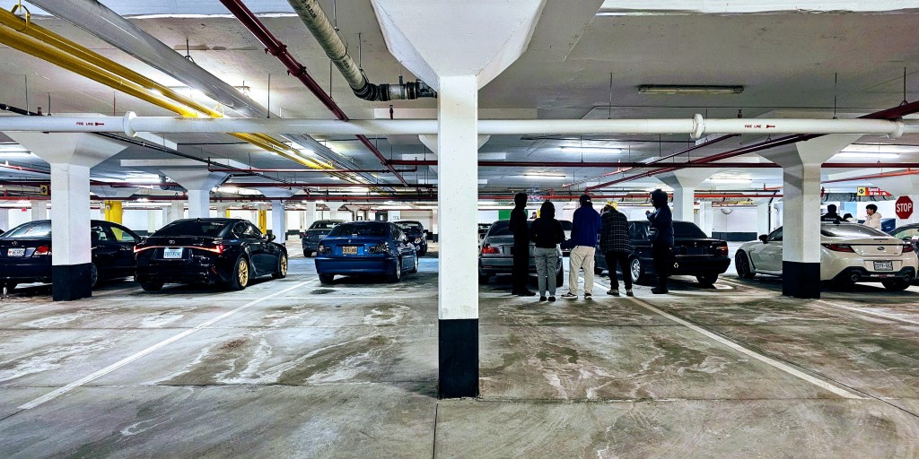 When the white guy moves to Japan, his new friend takes him to a car meet in a parking garage. I thought this kne would be similar. But no blasting music or racing up the ramps. Cant ein ’em all.