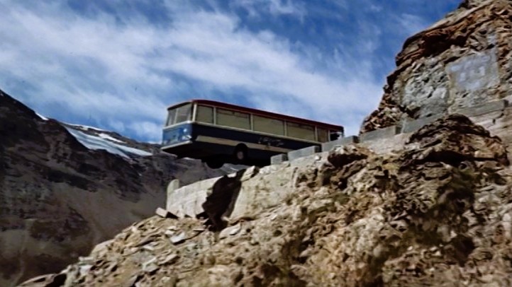 Once safely out of town, and on the expressway, the Mini Coopers are driven up ramps and into the back of a modified 1964 Bedford VAL 14 bus. The gang then unloads the gold, and unceremoniously dumps the cars over the guardrails on mountain roads to look like traffic accidents.